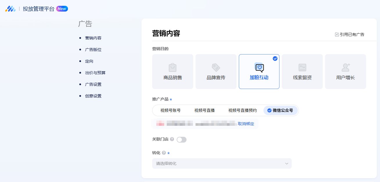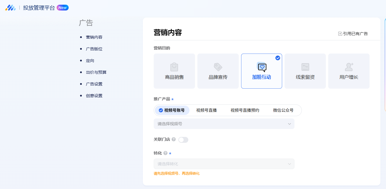 进入腾讯广告后台,新建计划时在 “推广目标” 中选择 “视频号推广”。根据需求选择子目标:若侧重提升视频播放量和账号粉丝数,优先选择 “视频号推广 – 加粉互动”;若视频带有产品种草属性,选择 “商品销售 – 视频号账号”(引导至小程序或私信咨询)。需注意,推广的视频需提前发布至视频号,且内容需符合平台规范,无违规信息。