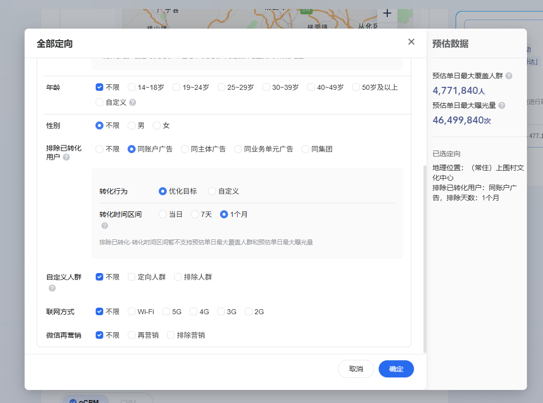 • 排除定向:务必勾选 “已关注该公众号”,避免向现有粉丝重复推送,造成预算浪费。